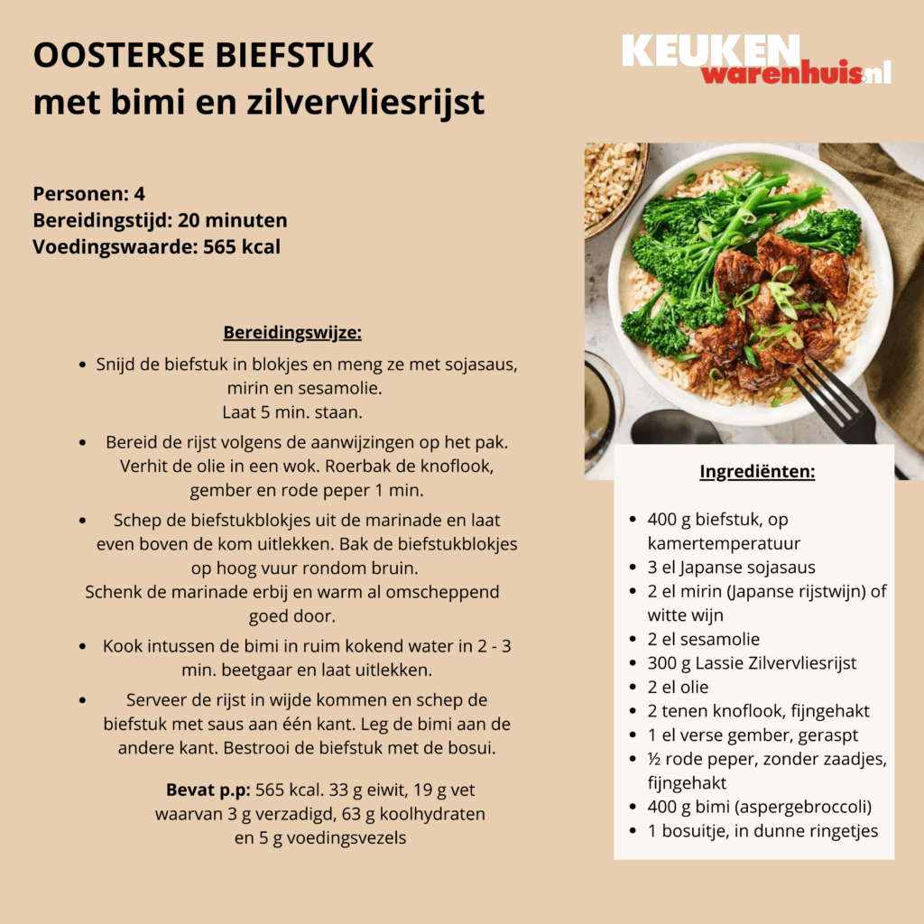 Om die reden is er door Keukenwarenhuis.nl een speciaal recept ontwikkeld. “Met onze missie: ‘Mensen blij maken’ willen wij jullie ook een helpende hand bieden in het bereiken van jullie sportieve doelen.” In de afbeelding staat een energierijk recept die als perfecte voorbereiding dient voor een grote krachtsinspanning. Naast voedzaam, ook heel lekker! Dus je hoeft niet meer te verzinnen wat je gaat eten de avond voorafgaand aan de Keukenwarenhuis.nl 20 van Alphen!