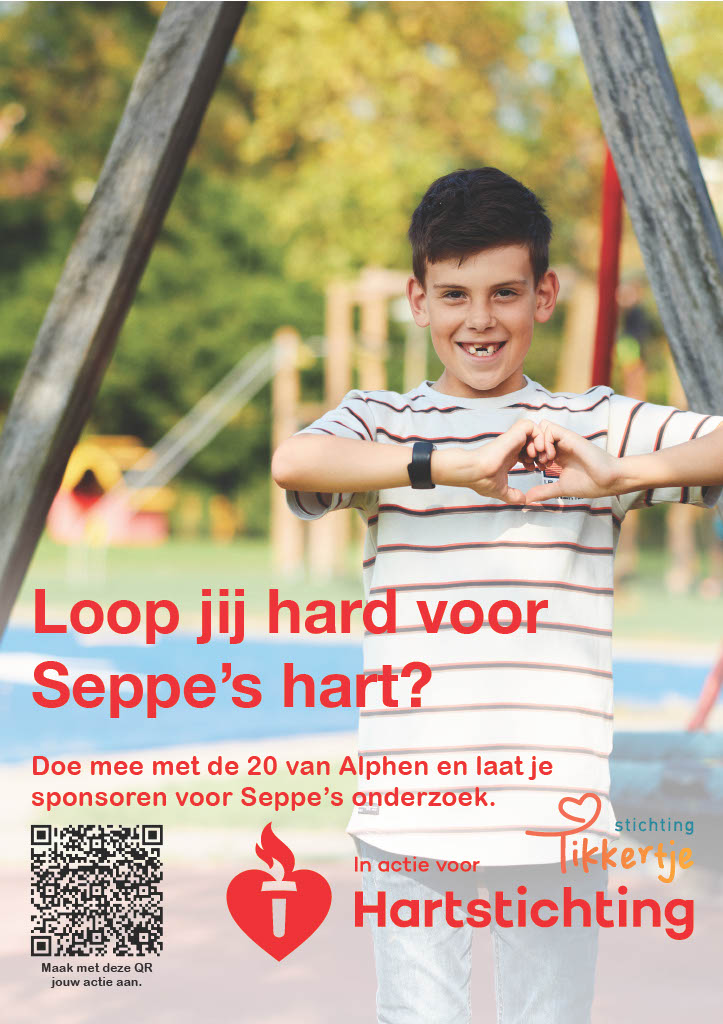 U kunt een donatie doen op het moment dat u een inschrijfbewijs voor één van de afstanden van de 20 van Alphen koopt. Als u doneert dan gaat uw donatie 100% naar het onderzoek, het Tikkertje-fonds van de Hartstichting. Dank je wel, namens Seppe en zijn ouders.